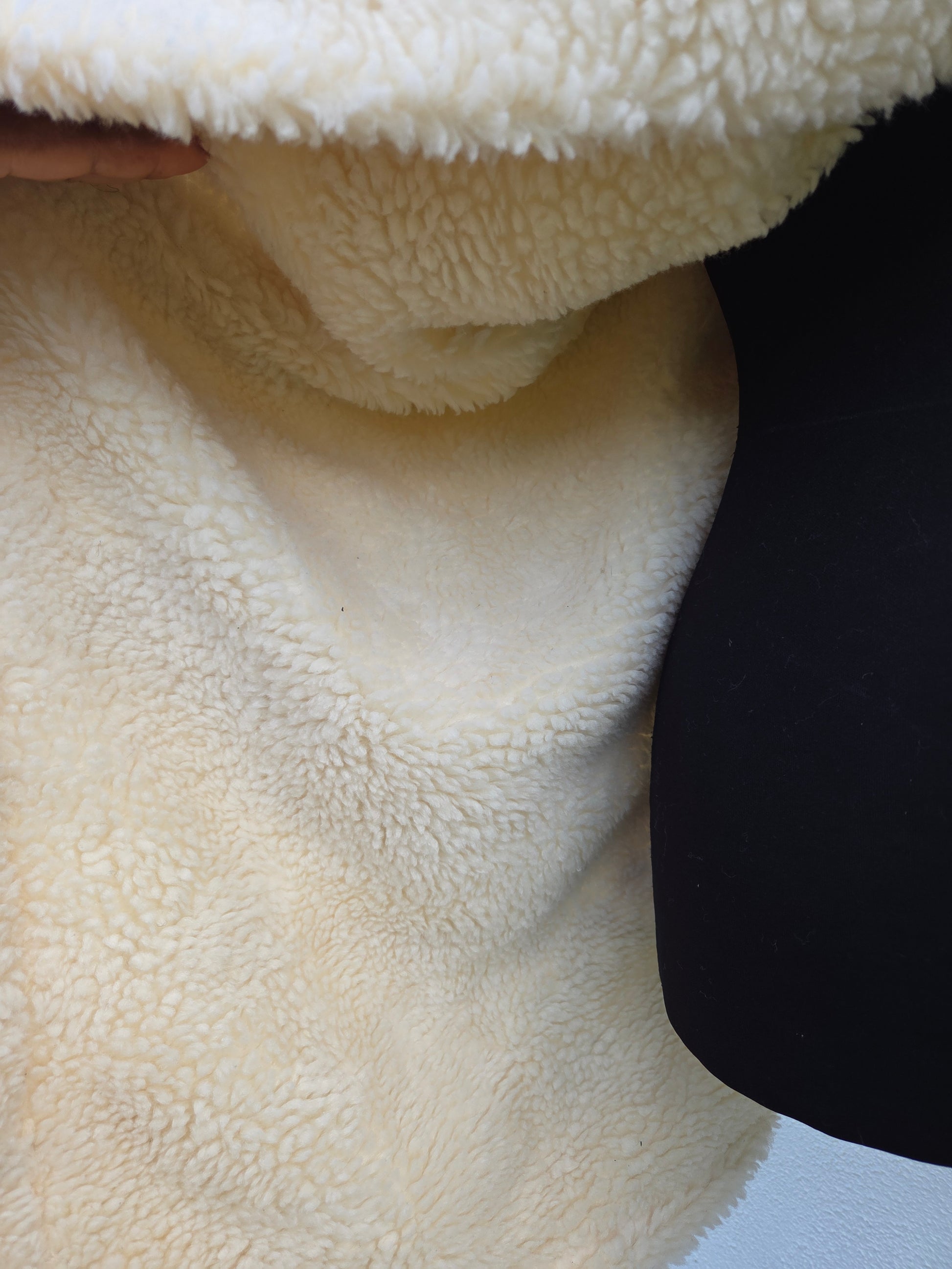 Upcycled dress used for the outer of the cape, and sherpa wool fleece used for the lining. Handmade in Tipperary Ireland